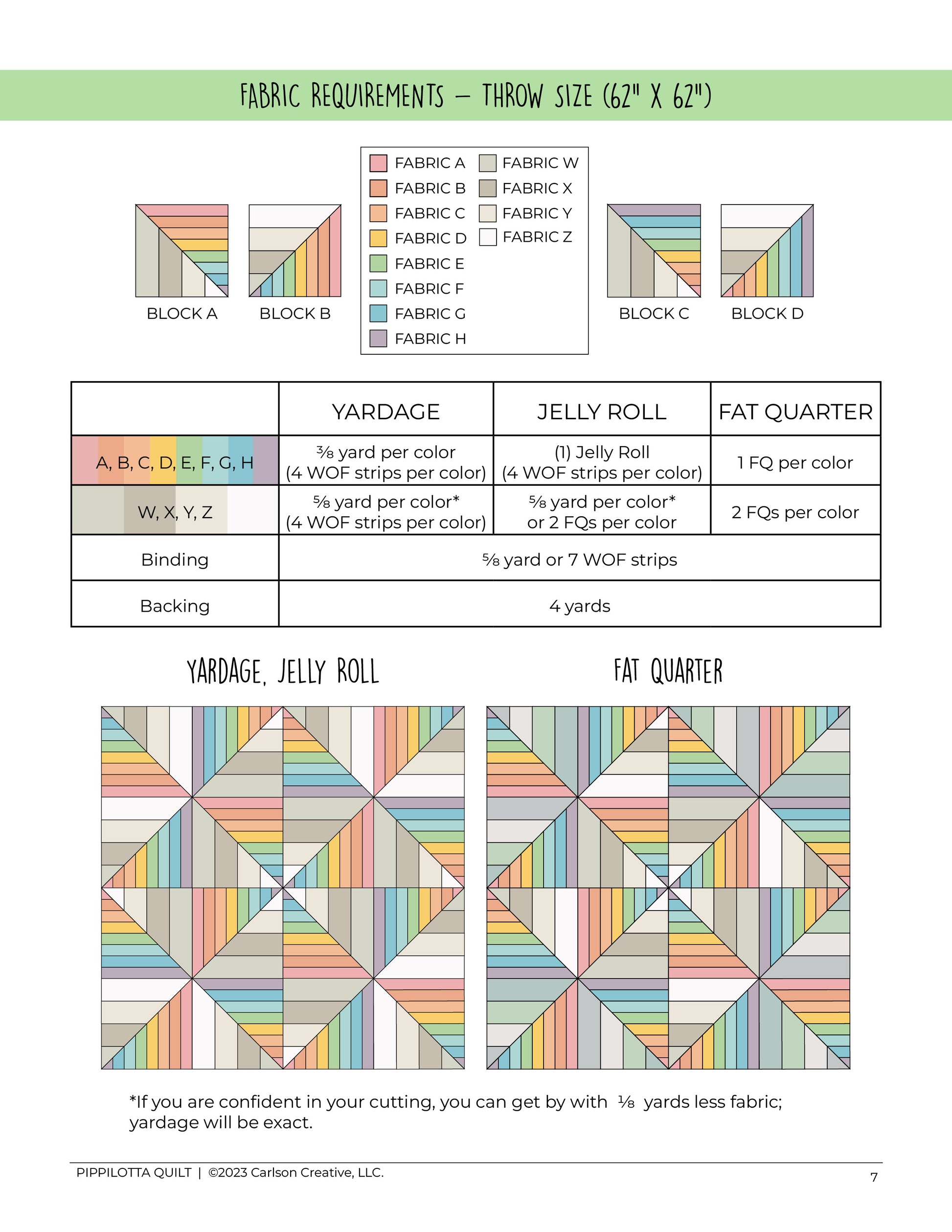The pattern includes instructions for yardage, fat quarter, jelly roll and scrappy versions as well as some other fun bonus ideas for how to use up your sewn-leftovers.